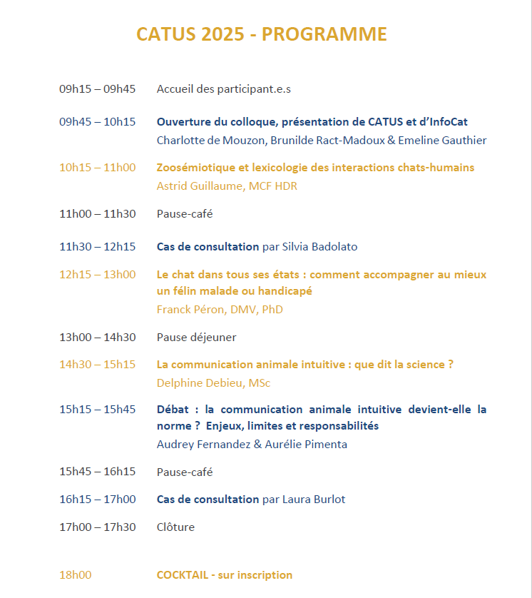 Le 3 octobre, je donnerai une conférence intitulée « Zoosémiotique et lexicologie des interactions chats-humains » au colloque Catus 2025 sur Les relations Chat-Humain. J’y parlerai de la pauvreté des mots français pour décrire les émotions des chats, de l’importance du lexique pour mieux comprendre les besoins des petits félins qui nous entourent ou qui vivent au quotidien avec nous. Je partagerai mes recherches de terrain sur les chats et mes différentes observations au contact des chats. Je parlerai également des travaux de ma doctorante, Margot de la Broise, qui prépare une thèse de doctorat à Sorbonne Université sur les zoolangages et zoolangues des chats. Venez nombreux!