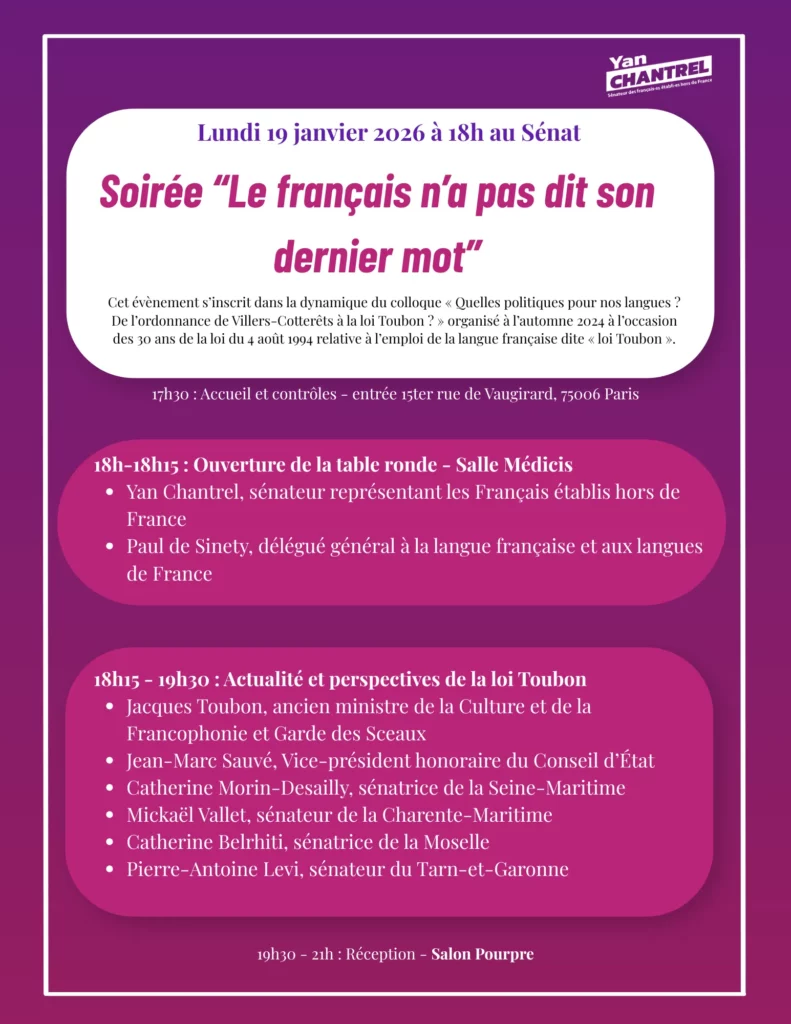 L’événement a réuni des personnalités de premier plan autour d’une table ronde consacrée à l’actualité et aux perspectives de la loi du 4 août 1994. Parmi les intervenants : Jacques Toubon, l’ancien ministre qui a porté cette loi emblématique, Jean-Marc Sauvé, vice-président honoraire du Conseil d’État, ainsi que plusieurs sénateurs engagés pour la défense de la francophonie.